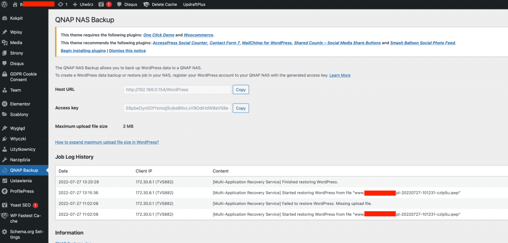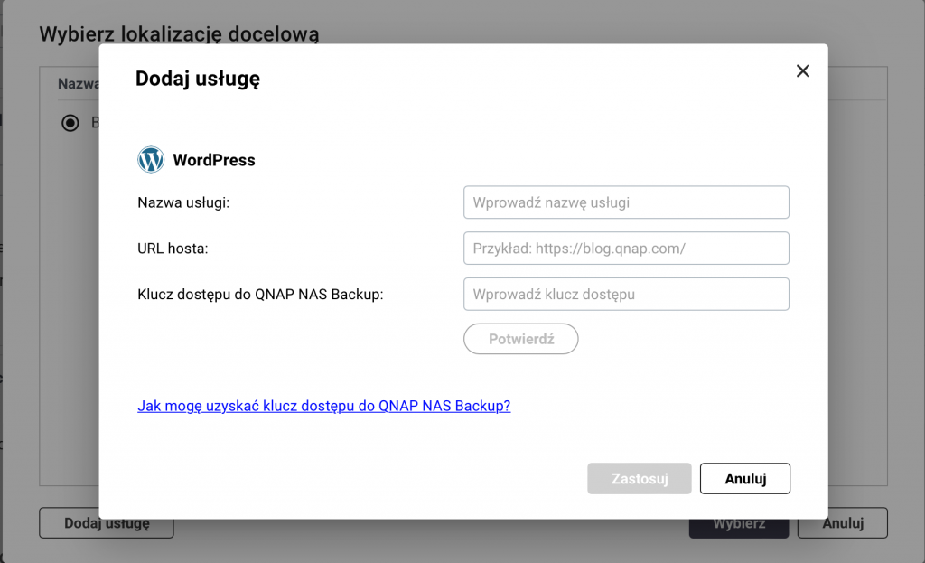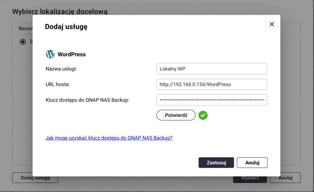 Kopiujemy parametry URL hosta i Klucz dostępu (w WordPress dostępne w “QNAP Backup”):