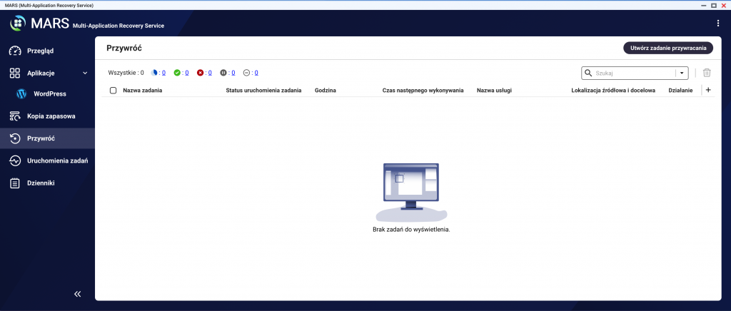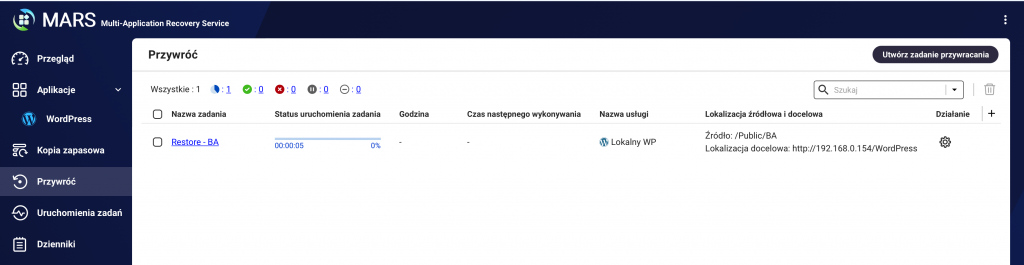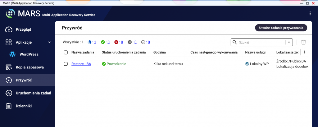 Tutaj powinna być widoczna informacja o wykonanym backupie. Przechodzimy w menu do “Przywróć”, gdzie klikamy “Utwórz zadanie przywracania”