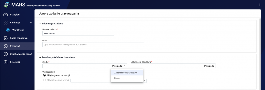 Tutaj wpisujemy nazwę zadania a następnie wskazujemy źródło plików backupu. Do dyspozycji mamy opcję “Zadanie kopii zapasowej”, które pozwala wskazać wcześniej wykonany backup w ramach aplikacji, lub możemy ręcznie wskazać katalog z backupem.