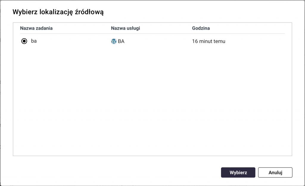 Na liście widoczne będą wszystkie wykonane backupy – jeśli podłączymy do MARS kilka witryn, wszystkie będą tutaj listowane. Zaznaczamy interesującą nas witrynę i klikamy Wybierz.