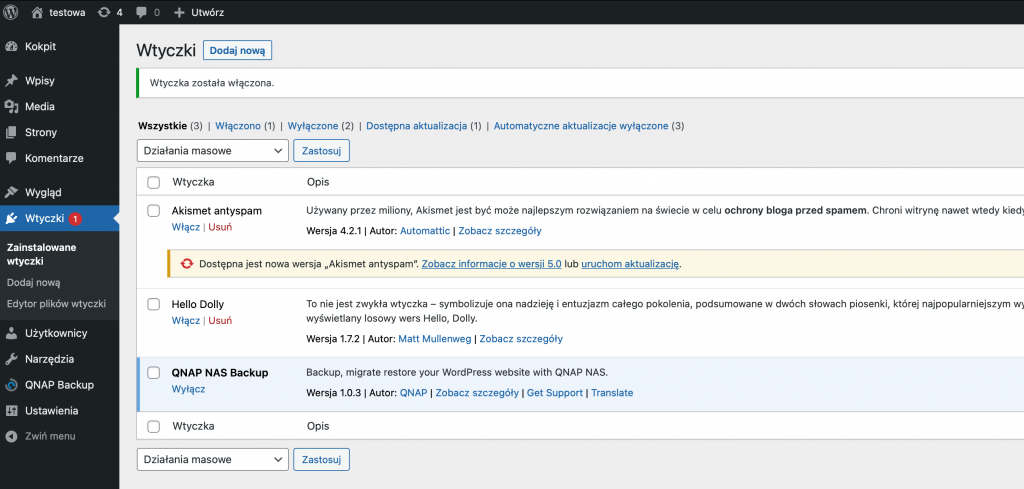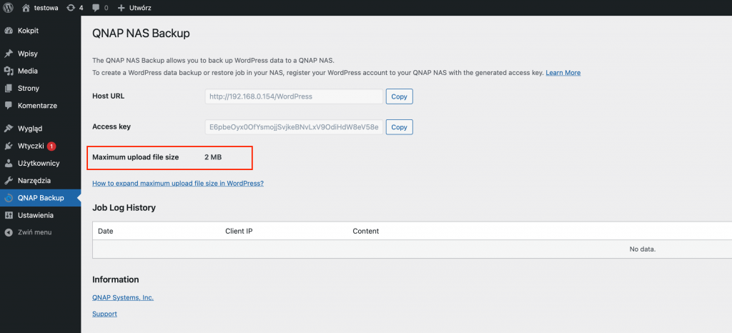 I tutaj w większości przypadków pojawi się błąd! jest to spowodowane standardowymi ustawieniami WordPress i PHP, które mają skonfigurowany limit wielkości przesyłanych plików. Bieżącą wartość możemy zweryfikować w WordPress wchodząc w plugin QNAP Backup: