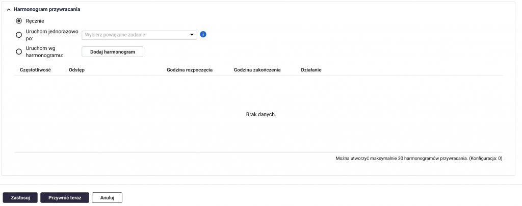 Przywracanie możemy zaplanować jako zadanie okresowe (np. możemy lokalnie przywracać codziennie kopię produkcyjnej witryny), możemy przywrócić w określonym czasie (np. w nocy) albo zrobić to ręcznie, klikając na “Przywróć teraz”