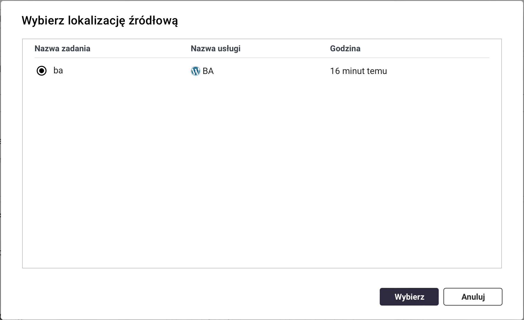 Tutaj wpisujemy nazwę zadania a następnie wskazujemy źródło plików backupu. Do dyspozycji mamy opcję “Zadanie kopii zapasowej”, które pozwala wskazać wcześniej wykonany backup w ramach aplikacji, lub możemy ręcznie wskazać katalog z backupem.