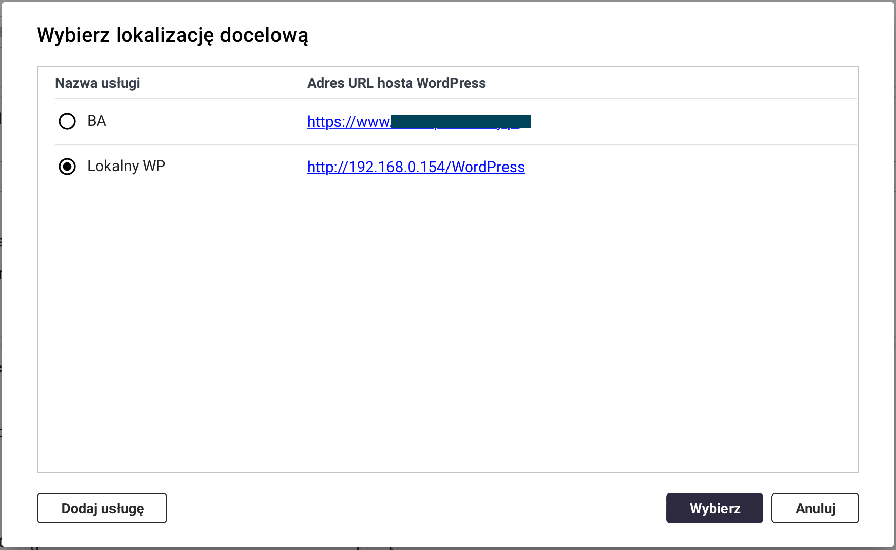 Pamiętajmy, aby z listy wybrać odpowiednią witrynę docelową, do której zostaną przywrócone dane z backupu.