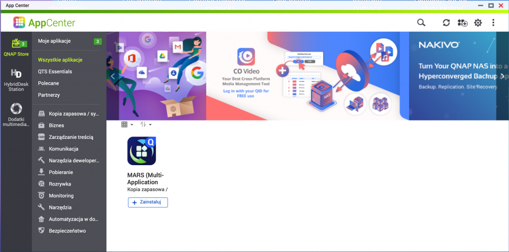 Rozpoczynamy od instalacji aplikacji MARS. Należy ją wyszukać w App Center i kliknąć “Zainstaluj”. Aplikacja do działania wymaga Container Station, więc system wyświetli odpowiedni komunikat, jeśli aplikacja jeszcze nie działa na danym QNAP.