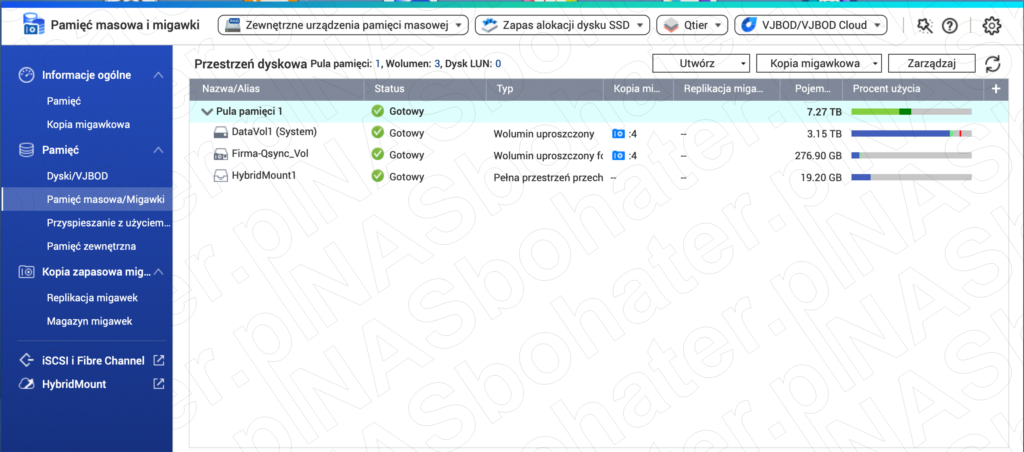 Funkcję wymiany dysków na większe znajdziemy w aplikacji Pamięć masowa i migawki, gdzie przechodzimy do części Pamięć masowa/migawki. Zobaczymy tam nasze pule pamięci i woluminy (na zrzucie widać już pojemność po wymianie dysków, ale w procesie zmieniamy dyski 4TB na 8TB).