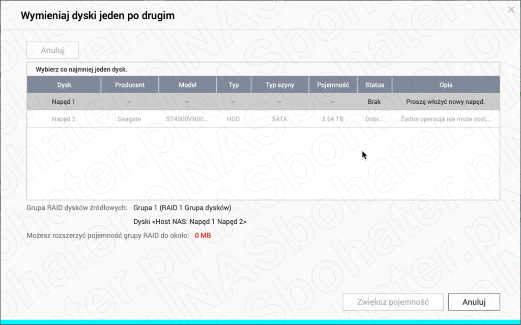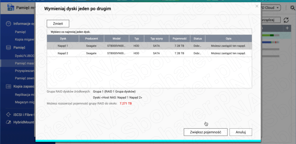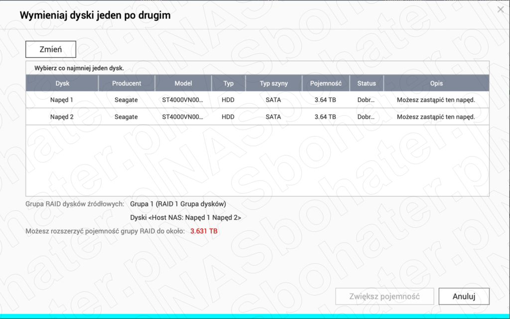 Zostanie wyświetlone okno, w którym przeprowadzimy proces wymiany dysków na większe. Niezależnie od liczby dysków w urządzeniu, tutaj zobaczymy wszystkie dyski wchodzące w skład zarządzanej puli pamięci.