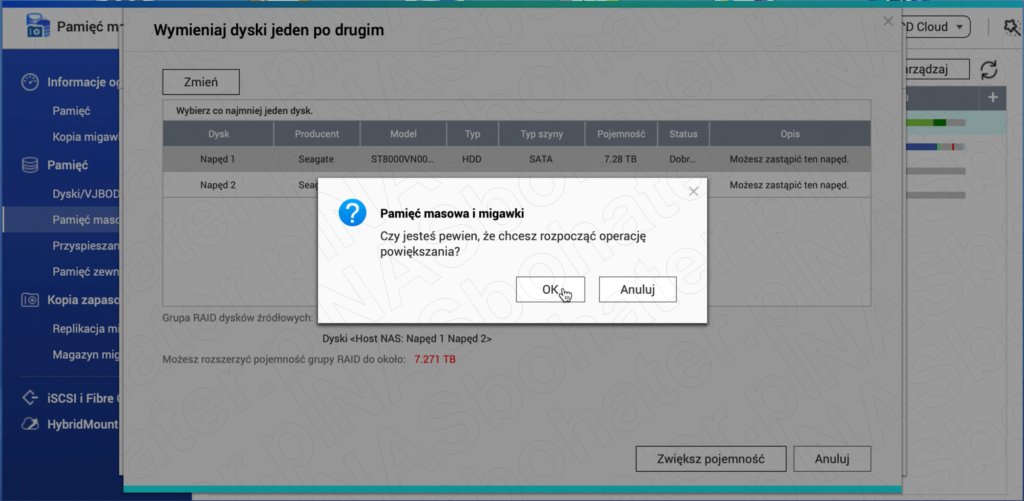 Uwaga – opcja wymiany dysków jeden po drugim działa w trakcie pracy urządzenia, więc cały czas możemy korzystać z urządzania i danych. Dodatkowo opcja ta nie wymaga dodatkowego kopiowania danych na nośniki pośrednie. Jednak musimy zawsze mieć na względzie, że wymiana dysku powoduje degradację grupy dysków. To oznacza, że na tym etapie nasza grupa dysków jest bardziej narażona na szkodzenia i błędy. Podczas odbudowy wszystkie dyski pracują pod dużo większym obciążeniem i może się okazać, że któryś z nich zacznie pracować niepoprawnie, zagrażając naszym danym. Dlatego zawsze przed rozpoczęciem takich działań jak opisane, powinniśmy utworzyć kopię bezpieczeństwa naszych danych!