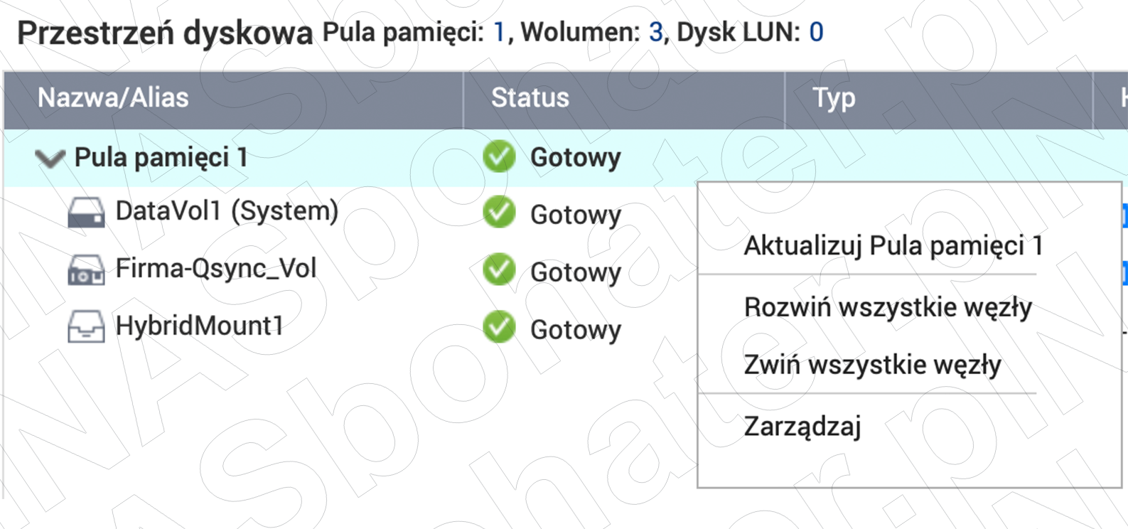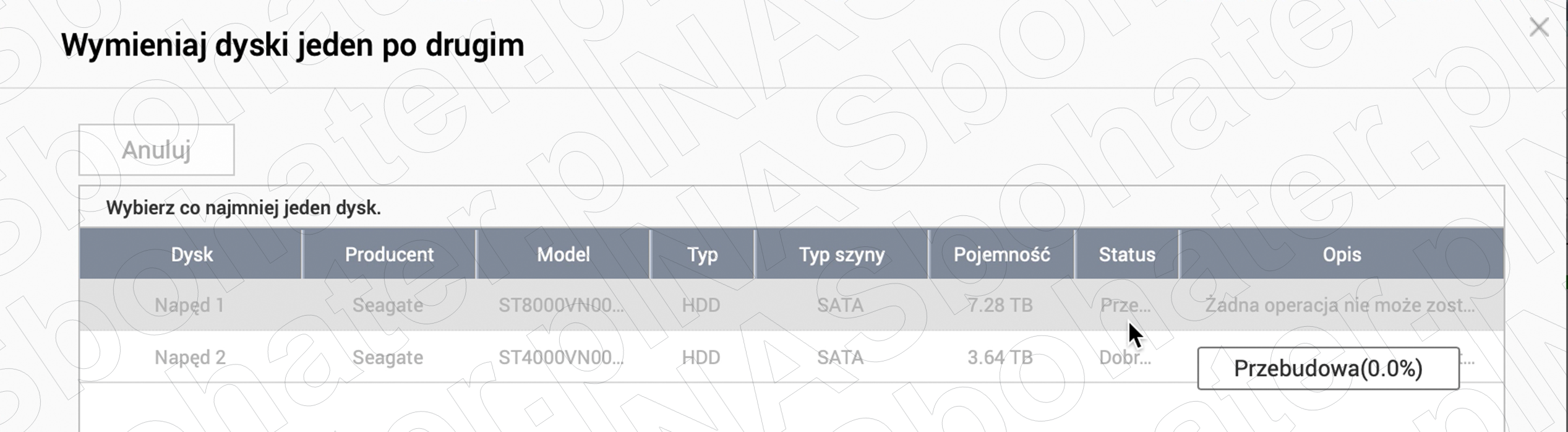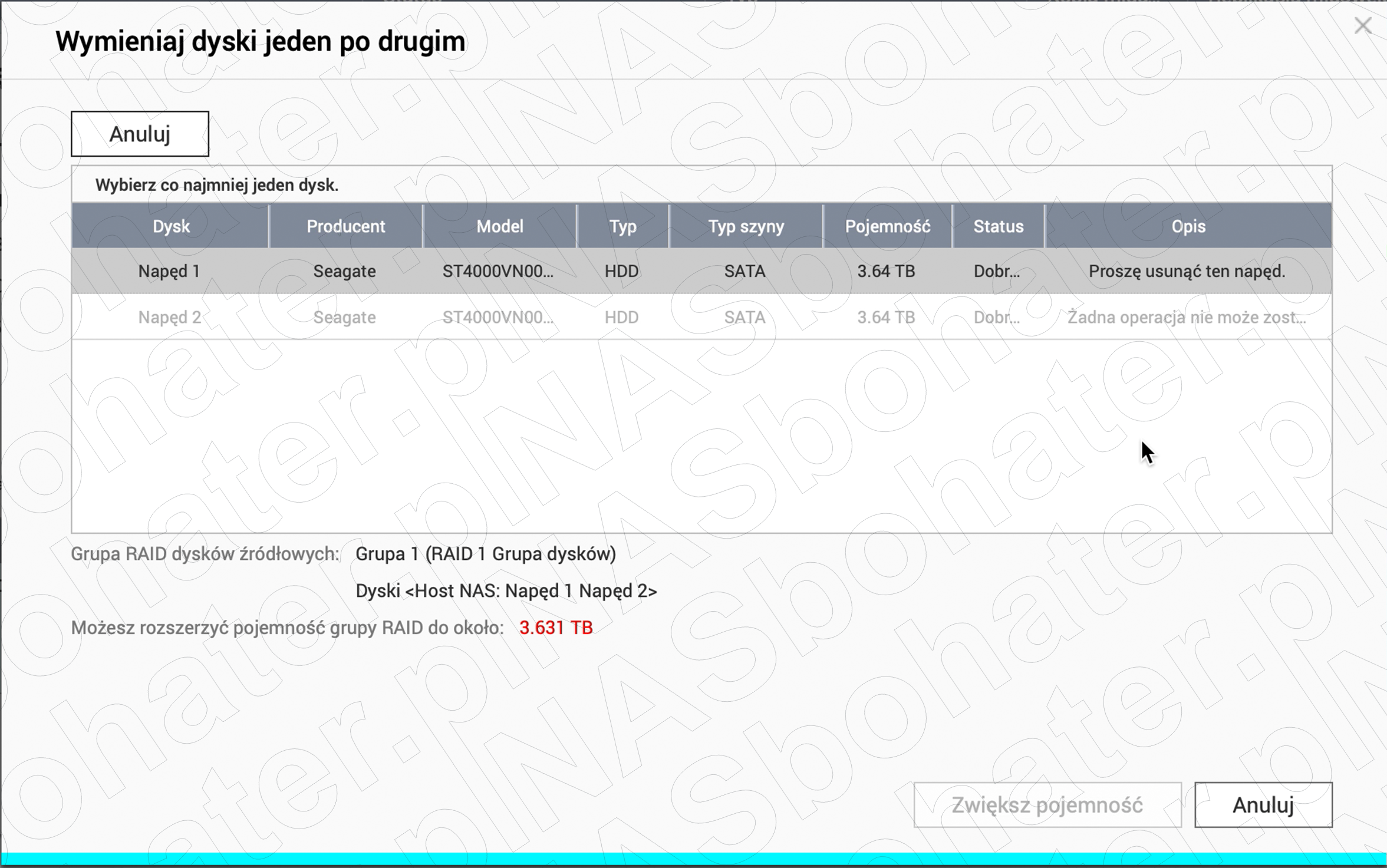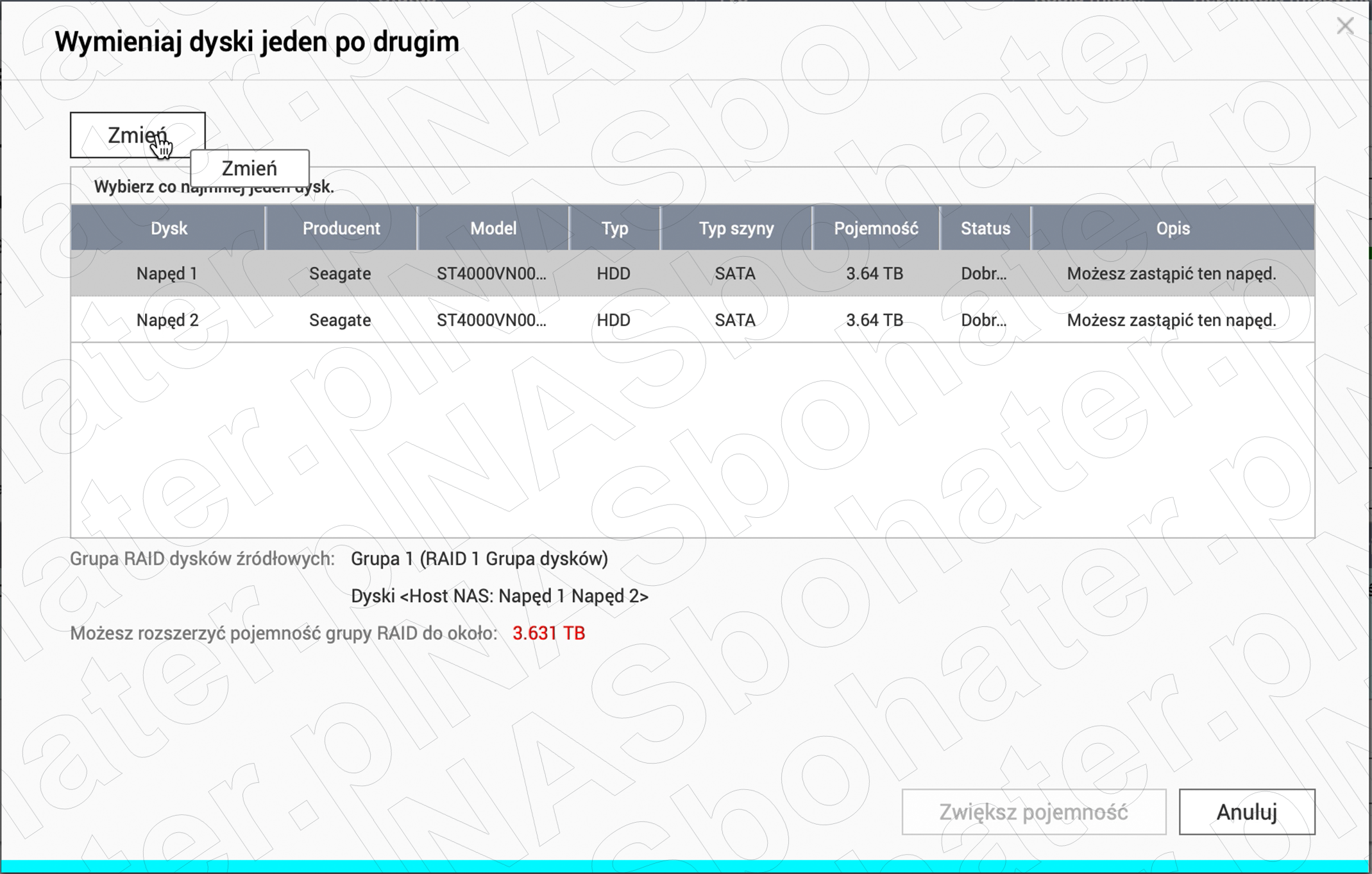 Zostanie wyświetlone okno, w którym przeprowadzimy proces wymiany dysków na większe. Niezależnie od liczby dysków w urządzeniu, tutaj zobaczymy wszystkie dyski wchodzące w skład zarządzanej puli pamięci.