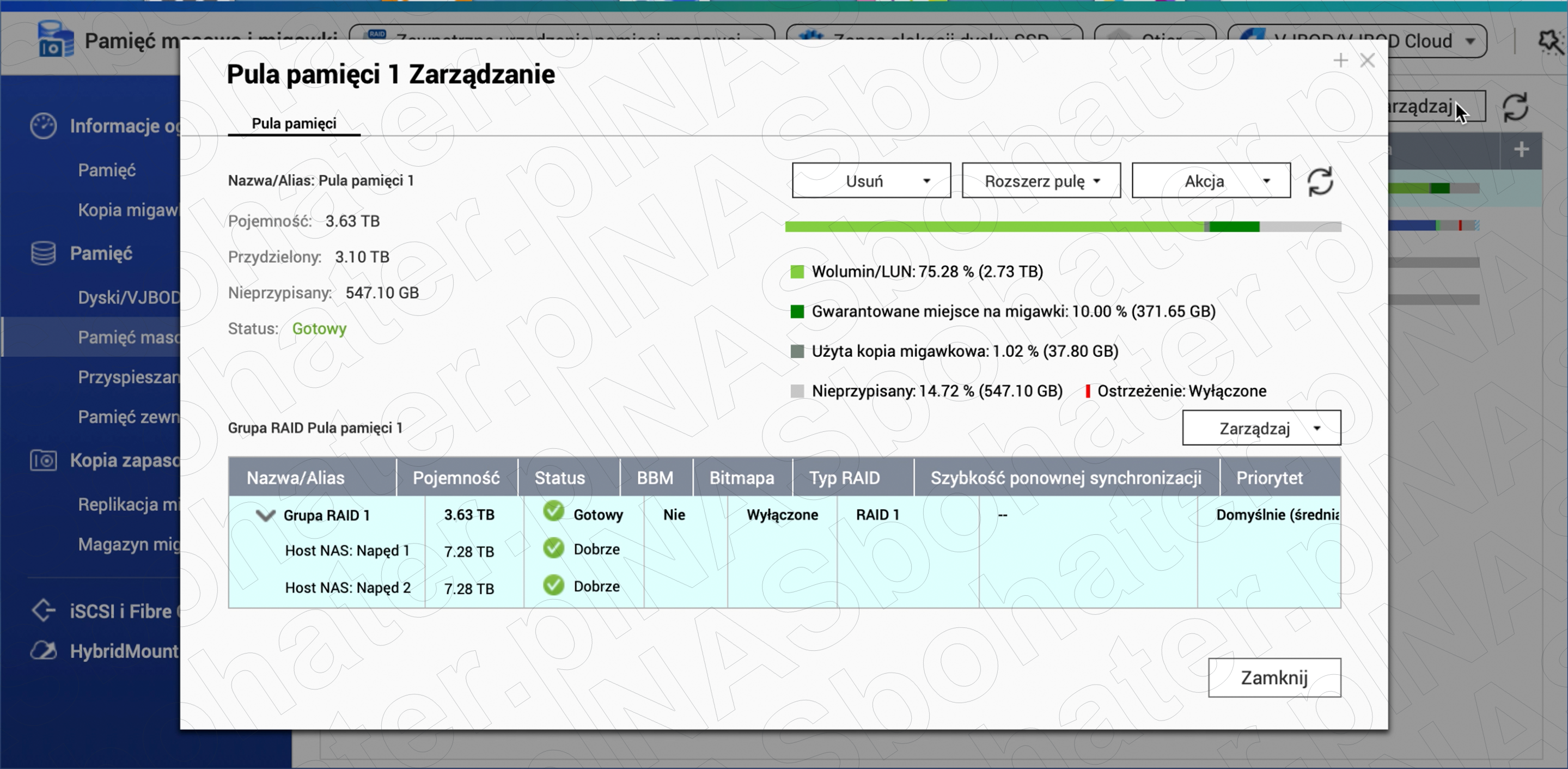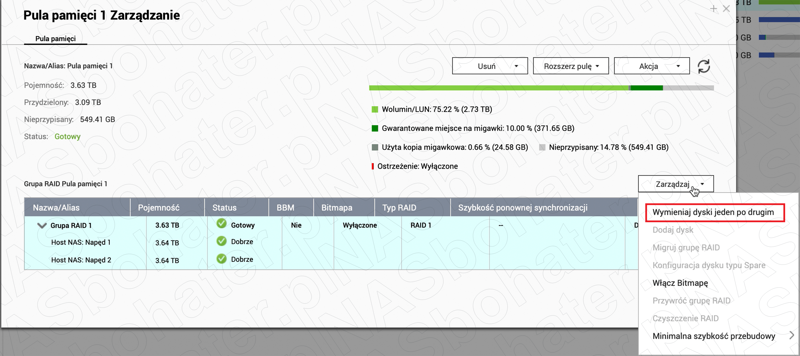 Zostanie wyświetlony ekran z podsumowaniem informacji o Puli Pamięci. Nas interesuje dolna część ekranu, gdzie wyświetlone są dane naszych grup RAID wchodzących w skład puli. Klikamy przycisk „Zarządzaj” i wybieramy opcję “Wymieniaj dyski jeden po drugim”