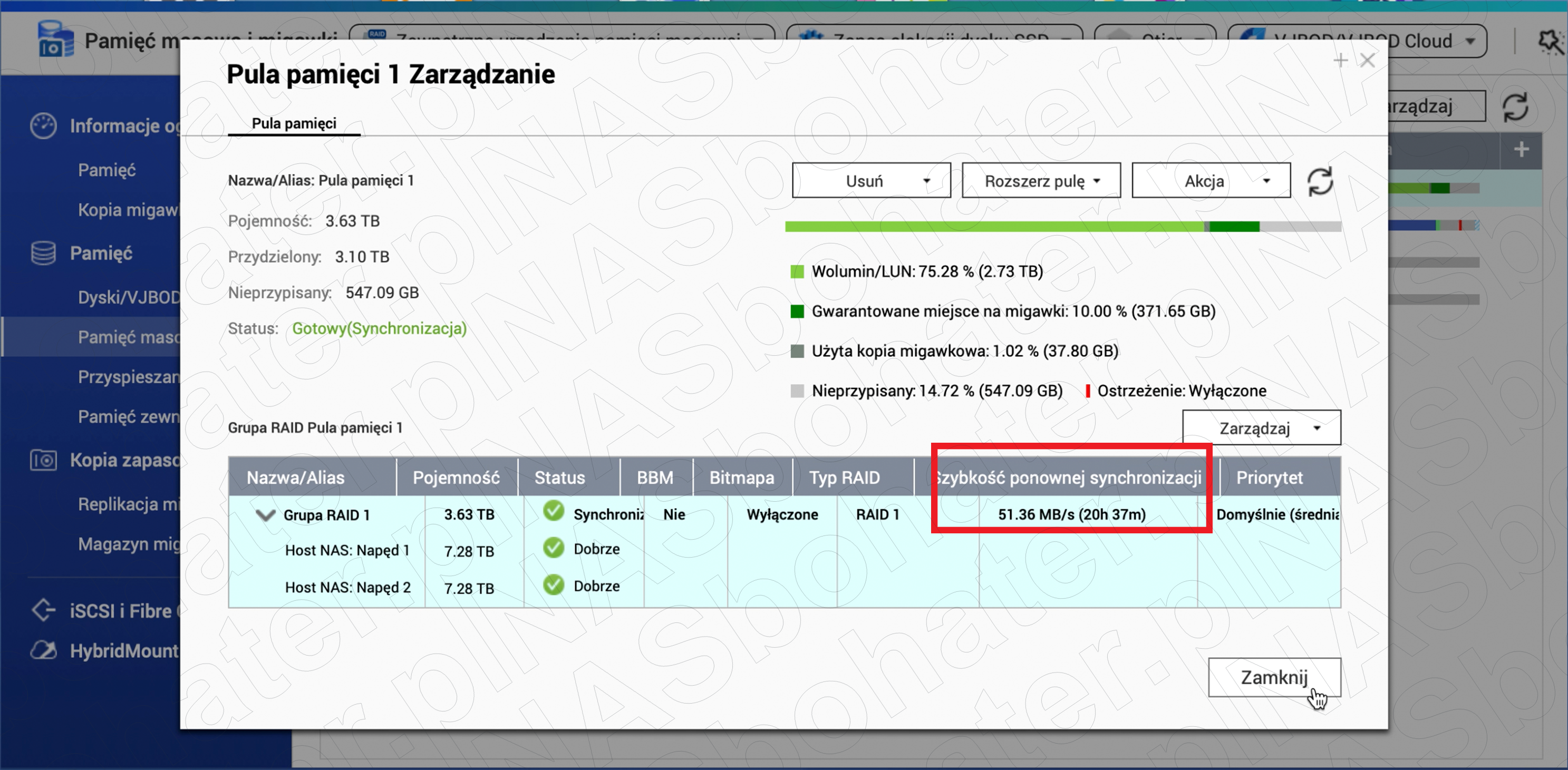 Uwaga – w tym procesie wymieniliśmy dyski na większe co spowodowało zwiększenie pojemności puli pamięci. Nie jest to jednoznaczne z powiększeniem woluminu – ten proces musimy przeprowadzić osobno. Ale o tym napiszę w osobnym artykule.